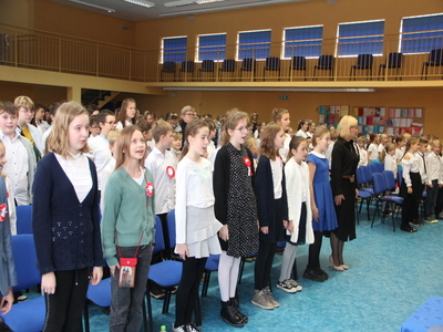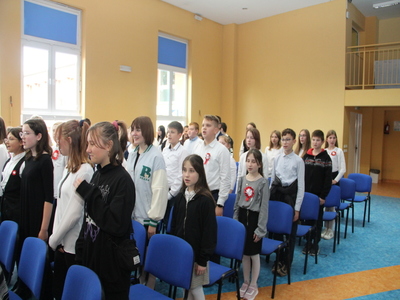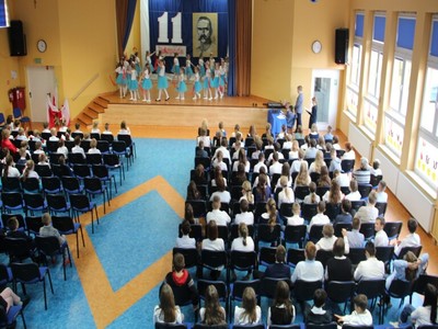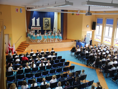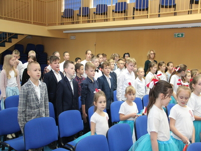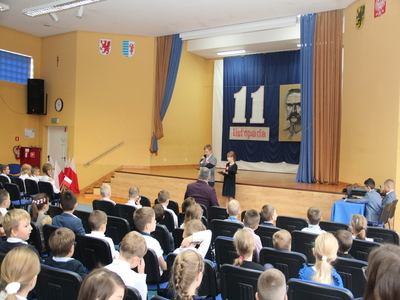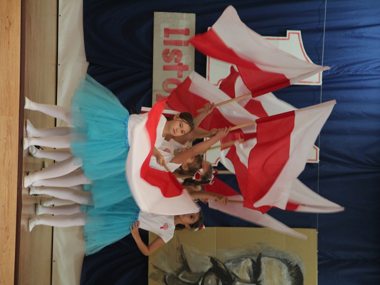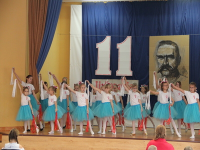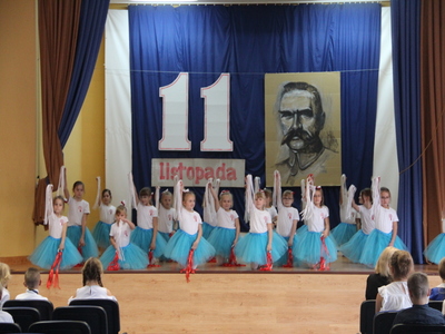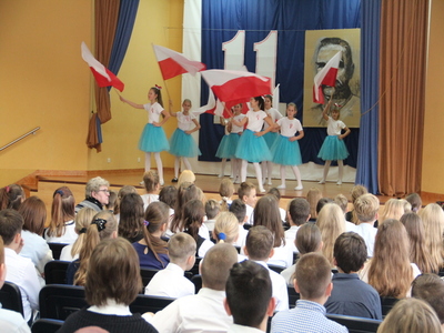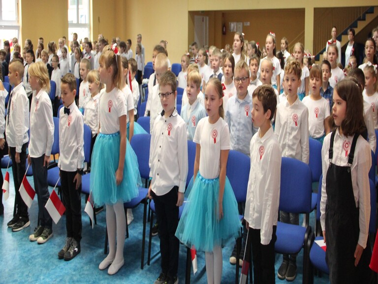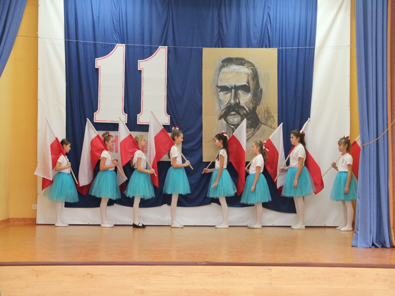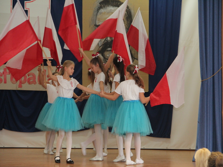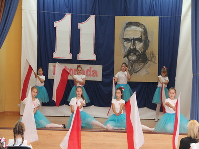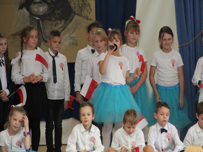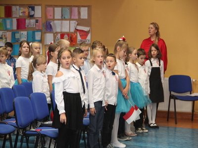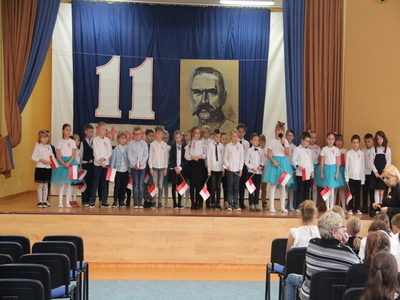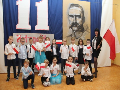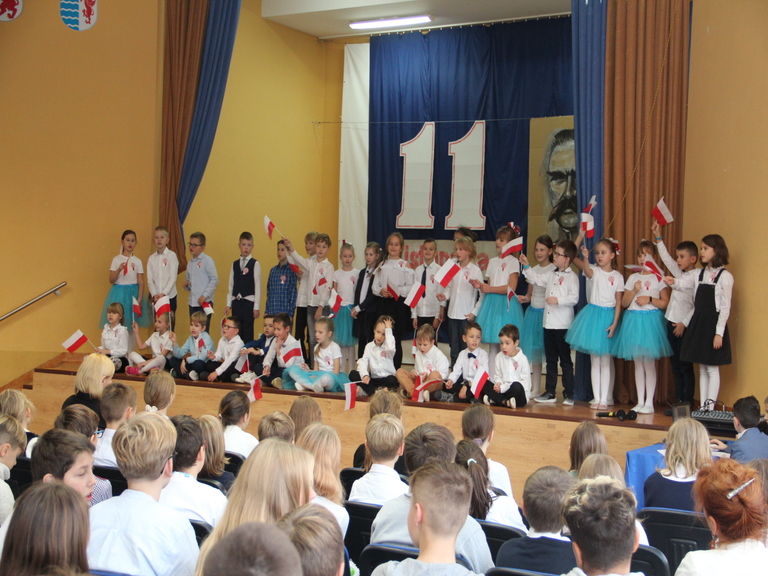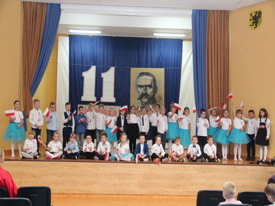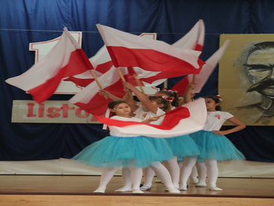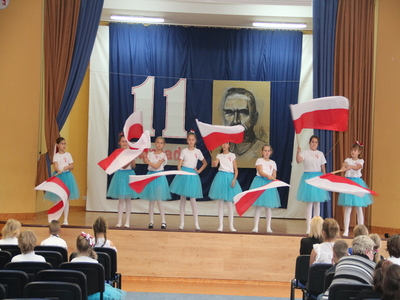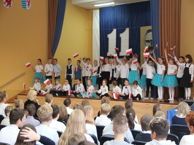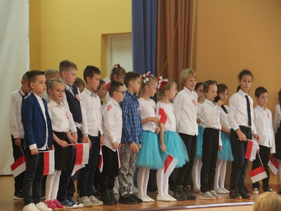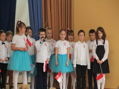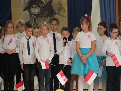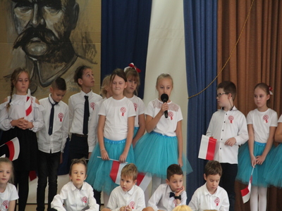 10 Listopada w Naszej Szkole, Odzyskanie Niepodległości przez Polskę uczczono podczas uroczystej akademii w wykonaniu uczniów klas IIB i IIC, którzy uczynili tę chwilę wzruszającą i podniosłą.Podczas tej uroczystości przypomniana została historia niewoli naszej ojczyzny, począwszy od dnia, kiedy Polska przestała istnieć na mapie Europy jako niepodległe państwo, przez dzieje tragicznej walki naszego narodu o wyzwolenie, aż po dzień odzyskania niepodległości. Przekazywane treści były przeplatane patriotycznymi pieśniami, recytacjami wierszy oraz tańcem w wykonaniu uczennic : Taniec z Flagami oraz najmłodszych dziewczynek do utworu: Co to jest Niepodległość? zespołu tanecznego „ Jedyneczka Dance” , co pozwoliło widzom głębiej przeżyć tamte chwile. Apel poprowadzili uczniowie z klasy 5c Julia Szala i 5 B Grzegorz Bielski a nad nagłośnieniem czuwali uczniowie z klasy 5 B AleksanderWasilewski iAlan Wieczorkiewicz. Aby podkreślić uroczysty charakter tego dnia cała społeczność szkolna miała przypięte kotyliony w barwach narodowych.