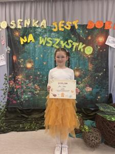 Dnia 7 maja 2025 uczennica klasy 1 c Julia Muller wyśpiewała II miejsce w konkursie międzyszkolnym organizowanym w SP12 PIOSENKA JEST DOBRA NA WSZYSTKO .