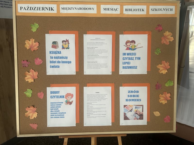 Każda klasa wykonuje w swojej sali gazetkę dotyczącą Miesiąca Bibliotek Szkolnych i promującą czytelnictwo. Prosimy o zakończenie prac do 21 października. Komisja oceni gazetki 22 października.