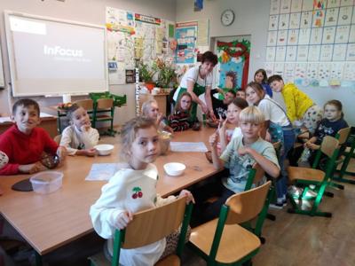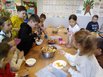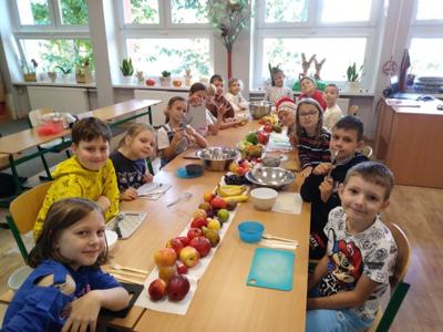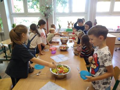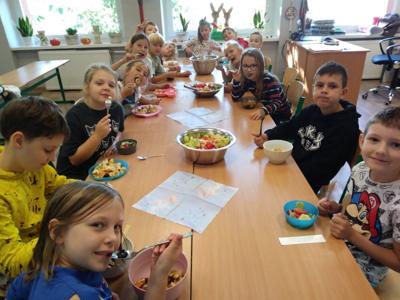 Jesień to czas zbiorów warzyw i owoców. W Klubie Przyjaciół Zdrowia często mówimy o ich bezcennych właściwościach odżywczych i wpływie na prawidłowy rozwój dzieci i młodzieży. Spożywamy je każdego dnia, ale w szkole rzadko w postaci sałatek. Dlatego postanowiliśmy przygotować  owocową i warzywną. Wyszły nam znakomicie, smakowały jeszcze lepiej. W głosowaniu na najlepszą zwyciężyła, zgadnijcie jaka? WARZYWNA! Zachęcamy do zajadania się owocami i warzywami każdego dnia!