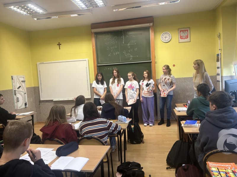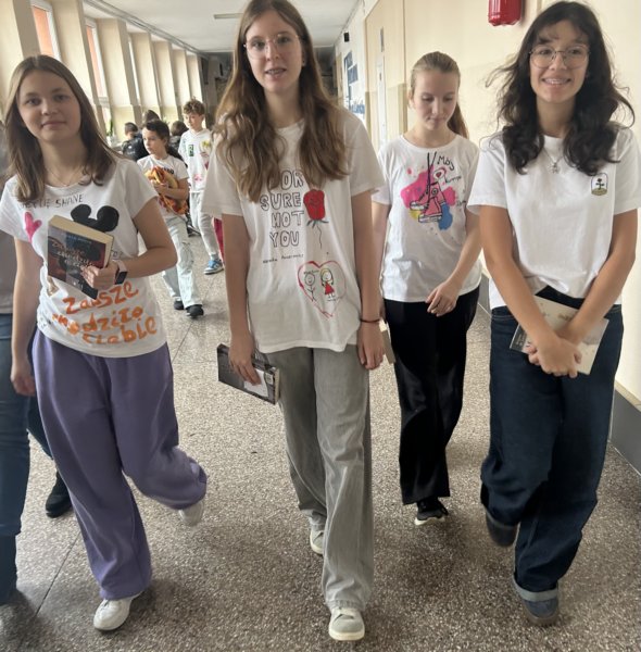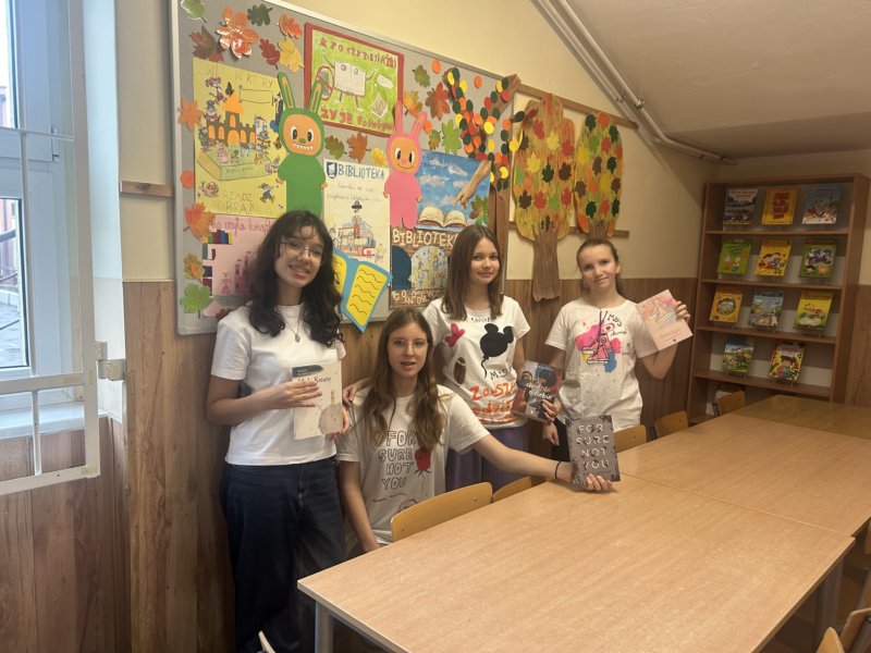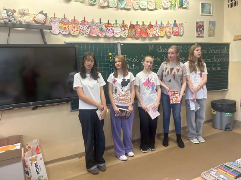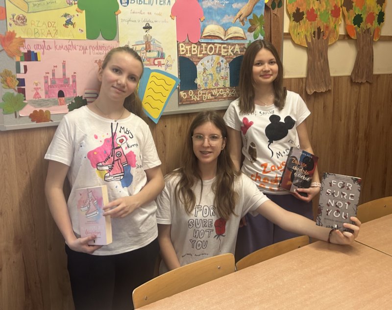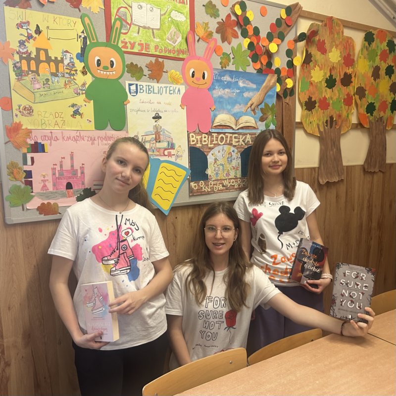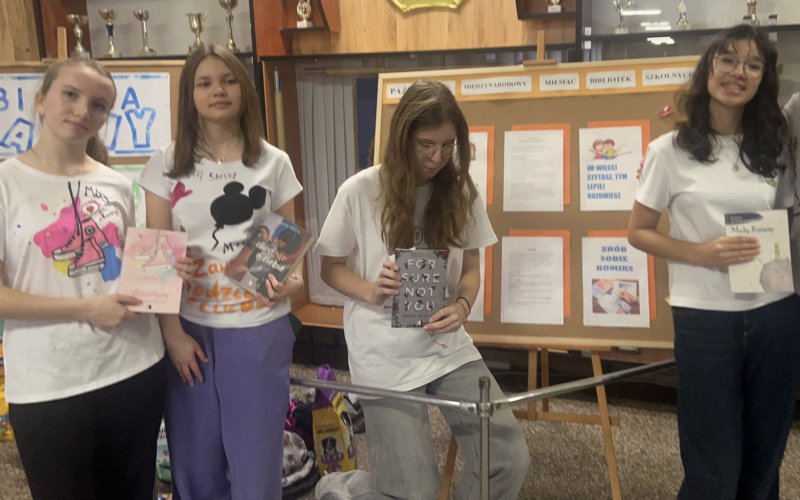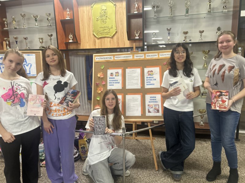 28 października 2025 r. w ramach obchodów Międzynarodowego Miesiąca Bibliotek Szkolnych uczennice klasy VIII C: Maja Górska, Oliwia Stencel, Małgorzata Switalla, Dominika Wolska, Agata Ziemann prezentowały zaprojektowane i wykonane na koszulkach reklamy książek , które polecają do przeczytania swoim koleżankom i kolegom. Oglądający docenili wysiłek włożony w realizację. Projekty uznano za bardzo interesujące , wartościowe artystycznie i zachęcające do przeczytania proponowanych lektur.