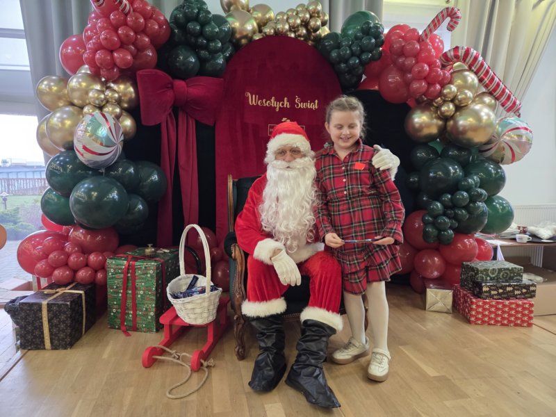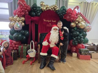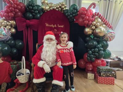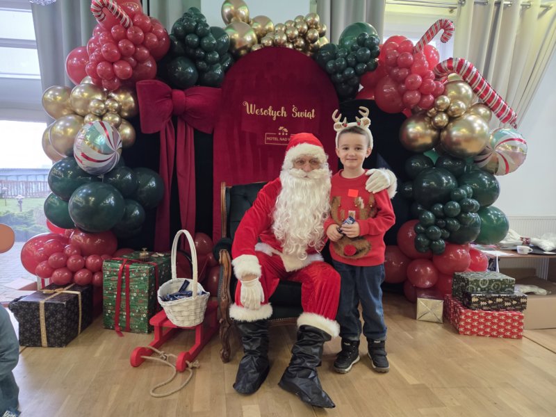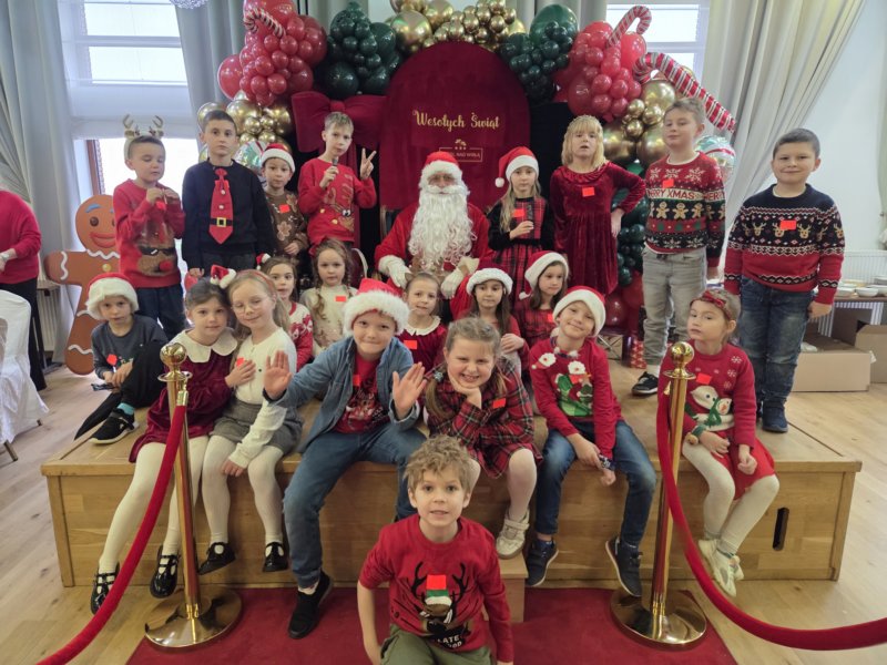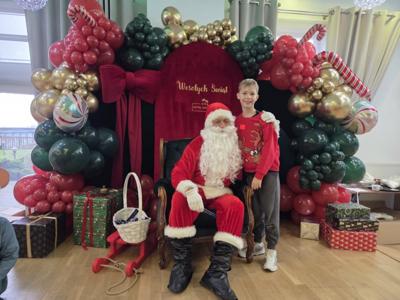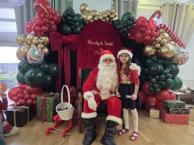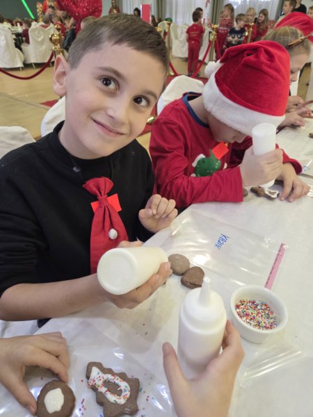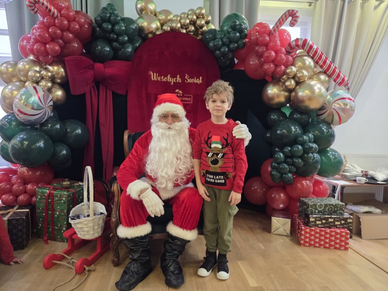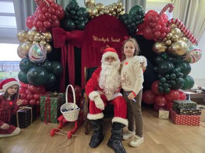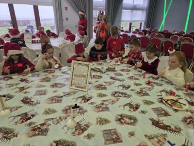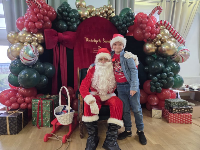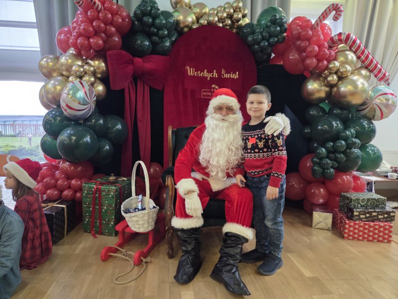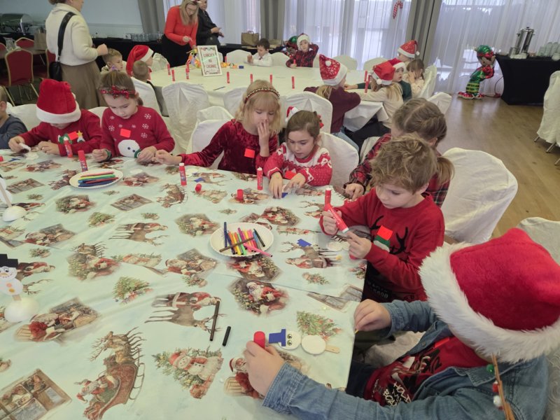 W piątek uczniowie klasy 1c wzięli udział w wyjątkowych warsztatach mikołajkowych, które odbyły się w Hotelu Nad Wisłą w Knybawie. Na wszystkich czekało wiele twórczych i pełnych radości zadań. Dzieci ozdabiały świąteczne pierniczki, wykonywały własne ozdoby z masy solnej oraz tworzyły kolorowe wydrapywanki. Nie zabrakło również wspólnego przygotowywania papierowych łańcuchów oraz pisania listów do Świętego Mikołaja. Dużą atrakcją dla uczniów był także dmuchaniec, który dostarczył mnóstwo ruchu i dobrej zabawy. W przerwie wszyscy zasiedli do pysznego obiadu – słodkich naleśników, które okazały się prawdziwym przysmakiem.Najbardziej niezapomnianym momentem tego dnia było jednak spotkanie ze Świętym Mikołajem. Dzieci z radością przywitały wyjątkowego gościa, który obdarzył je uśmiechem oraz ciepłymi słowami.Warsztaty upłynęły w atmosferze świątecznej magii, kreatywności i dobrej zabawy, a wspomnienia z tego dnia z pewnością pozostaną z uczniami na długo.